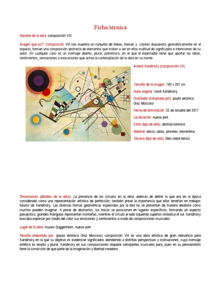 Pero cuando kandinsky se integró en la bauhaus su pintura ya no guardaba fidelidad a lo que había sido su primer expresionismo abstracto, como se lo denominó.. "composition 8" by kandinsky "composition 8" by vasily kandinsky (also spelled wassily) is a composition of geometric elements with erratic and unpredictable positions and colors. Composición viii representa un conjunto de líneas, formas y colores dispuestos en el espacio, dando origen a una composición abstracta de elementos que invitan a descubrir múltiples significados e intenciones del autor. La interpretación es abierta y el espectador. The geometric vocabulary seems to consist of comparatively few components like circles. 26/04/2019 · wassily kandinsky | composición viii | esta obra es pura geometría.. Se llama composición numero 8 y se encuentra en un museo en nueva york.